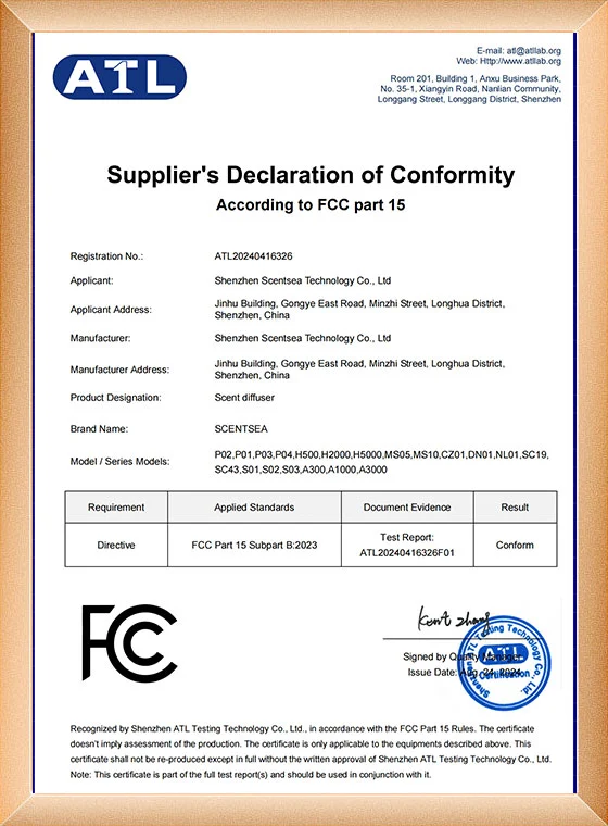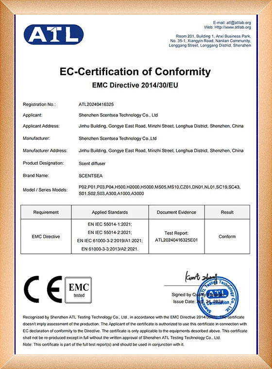 Wszystkie dyfuzory zapachowe SCENTSEA posiadają certyfikaty CE, ROHS, FCC i SGS. Do tej pory maszyny zapachowe SCENTSEA zostały zainstalowane w ponad 70 krajach i cieszą się dużym uznaniem naszych klientów.