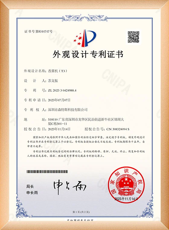 Jakość jest podstawą naszej działalności. Nasze dyfuzory zapachowe posiadają certyfikaty CE, RoHS i FCC. Poza tym wszystkie nasze produkty posiadają ekskluzywną formę i opatentowane.